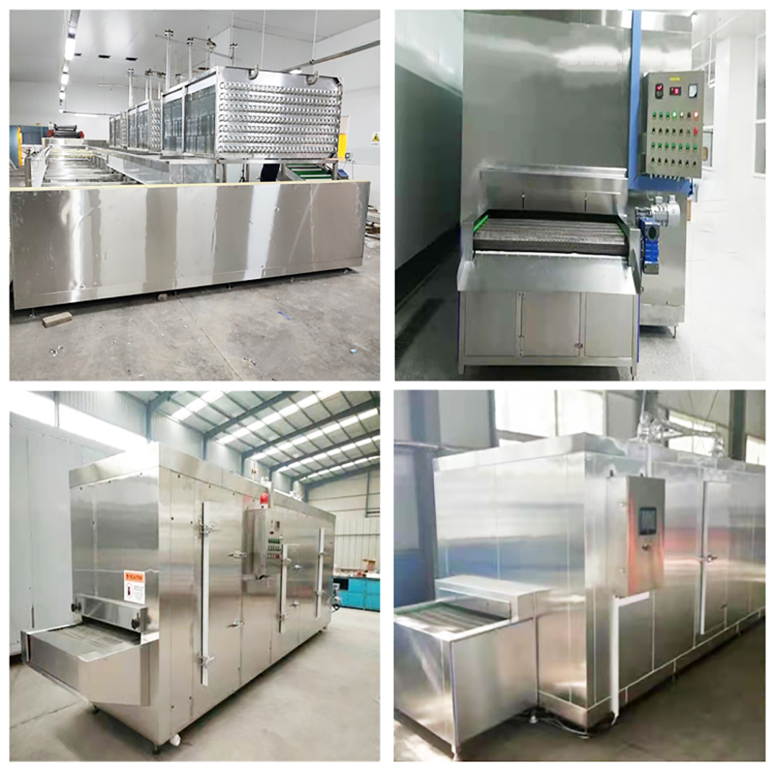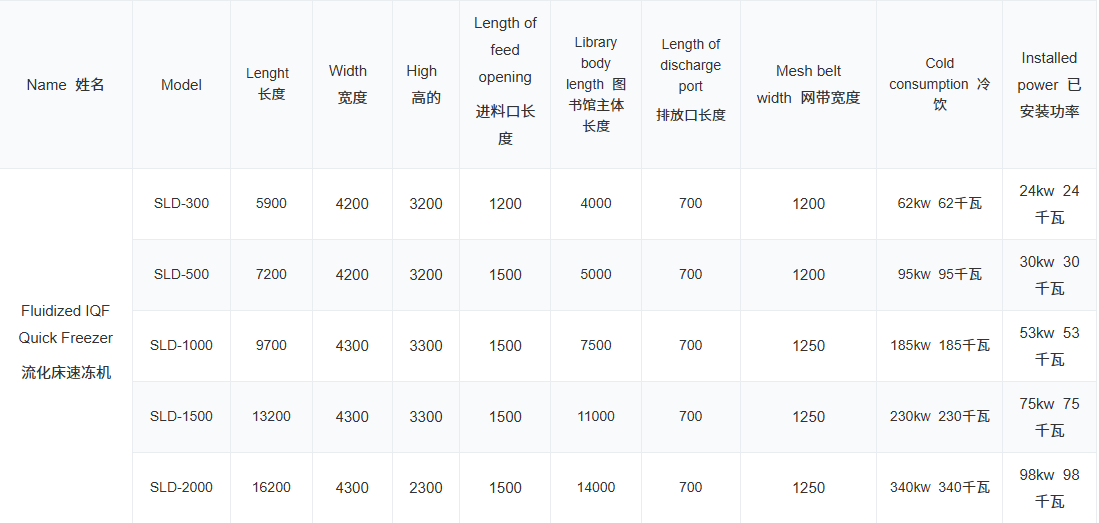 This quick-freezing device series is a necessary equipment for realizing the fluidized monomer freezing of fruits and vegetables, fresh foods and some seafood. The product will not be deformed or broken to a large extent during the freezing process. The operation of the mesh belt is infinitely variable, and the speed range is wide. The user can change the running speed of the mesh belt according to the different materials, thereby changing the freezing time. When the frozen product moves on the stainless-steel conveyor belt, the frozen crystal layer starts to move with the increase of the airflow speed. When the wind pressure reaches a certain value, the food no longer remains stationary, and the food is blown vertically upward at a high speed, and part of it is suspended. Upward, causing the bed to expand and the porosity to increase, that is, a fluidized bed is formed; the suspended particles are surrounded by low temperature and air temperature, and the frozen product is rapidly frozen to form monomers. At the same time, a mechanical impulse vibration device is designed under the mesh belt, and the food particles are separated by vibration while the surface of the food particles are frozen, effectively avoiding mutual adhesion. The frozen product is quickly passed through three stages of cooling, surface freezing, and deep freezing to form the highest quality frozen product.