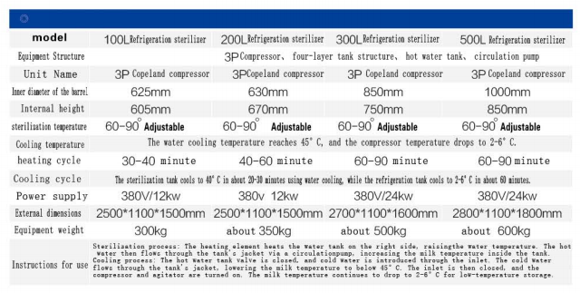 The equipment consists of a milk tank, hot water tank, compressor, circulation pump, base, etc., and includes a stirring mechanism and an automatic temperature control system. The sterilization temperature is adjustable from 40-90°C, and the refrigeration temperature is 2-6°C. Sizes from 100L to 500L can be customized. It is essentially a combination of a sterilization tank and a refrigeration tank, providing both sterilization and refrigeration storage functions.